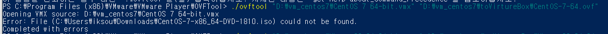 VMWare player 용 가상머신으로 Centos7 과 Ubuntu20.04 버전용 두개가 있었다. Centos7 에는 각종 웹 사이트를 돌리는 PHP와 Node.js 로 작성된 소스들과 온갖 설정들이 들어 있으며 Ubunto20.04에는 Python을 위한 Anaconda가 설정되어 있었다. 이걸 맥 PC로 옮기려다 보니, virtualbox로 가야했고, 그래서 변환이 필요했다. - vmware 하위 변환 tool인 ovftool로 변환 vmware player 디렉토리 하위에 ovftool.exe 파일을 찾는다. 내 경우 " C:\Program Files (x86)\VMware\VMware Player\OVFTool" 여기에 파일이 있었다. 커맨드 창(power shell) 에서 ovftool 을..